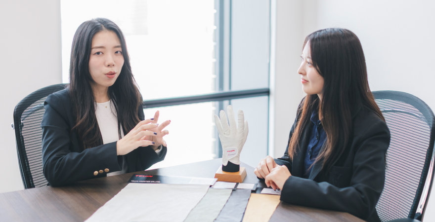 それから、衣料用テキスタイル部隊や製品部隊など、専門性の違うチームと一緒に動ける場面が増えたことも可能性を広げてくれています。衣料用テキスタイルと、「ナノフロント®」のような少し尖った高機能素材が一緒に並んでいるブースは、ほかではあまり見られないので、お客様から見ても意外なヒントを見つけやすく、面白いのではないかと思うんです。部署横断で「いろいろやってみよう!」という機運が高まる中、上司も「やりたいことはなんでもトライしてみなさい」と背中を押してくれるので、ありがたいですね。