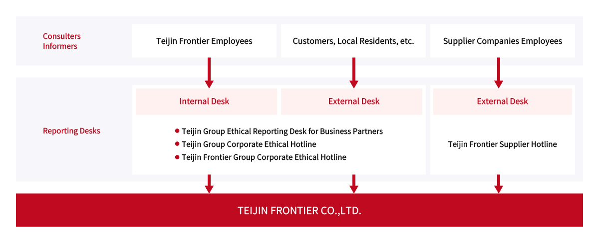 "Teijin Frontier Supplier Hotline" is a dedicated reporting window for employees of our important partner supplier companies to receive consultations regarding employment, working conditions, and other compliance-related matters.